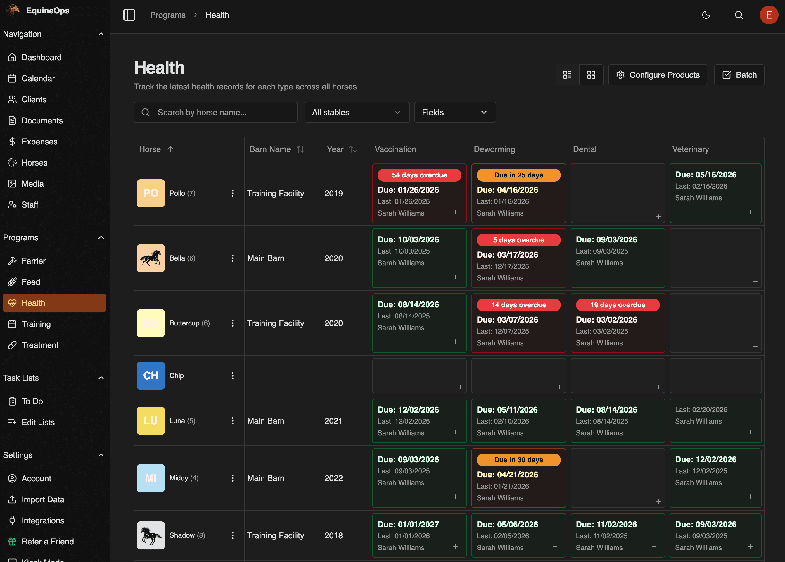 Track vaccinations, deworming, dental, and vet visits for every horse with EquineOps Health Program. Batch entry, document attachments, and direct access for your vet and dentist.